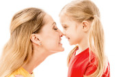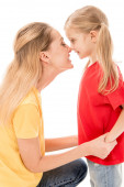 Widok z boku uśmiechnięta matka i córka trzymając ręce i patrząc na siebie na białym tle