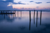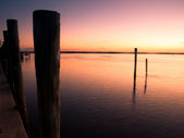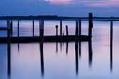 złamane molo i maszt statku złamane w wodzie po zachodzie słońca w biloxi, mississippi