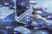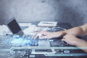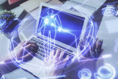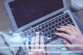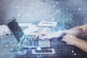 Człowiek wpisujący na tle klawiatury hologram mózgu. Pojęcie dużych zbiorów danych.