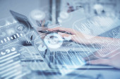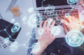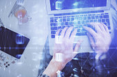 Zdjęcie "Człowiek wpisujący na tle klawiatury hologram mózgu. Pojęcie dużych zbiorów danych." może być wykorzystywane do celów osobistych i komercyjnych zgodnie z warunkami zakupionej licencji Royalty-free. Obraz jest dostępny do pobrania w jakości wysokiej rozdzielczości do 5760x3840.