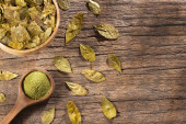 Zdjęcie "Suszone liście koki-Erythroxylum Coca" może być wykorzystywane do celów osobistych i komercyjnych zgodnie z warunkami zakupionej licencji Royalty-free. Obraz jest dostępny do pobrania w jakości wysokiej rozdzielczości do 5760x3840.