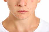 Młoda kobieta z problemem trądziku na białym tle, zbliżenie