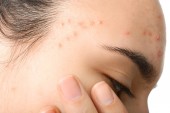 Młoda kobieta z problemem trądziku na białym tle, zbliżenie