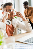 młody biznesmen stojący w pobliżu zmęczonego kolegi pracującego w nocy na laptopie