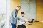 Zdjęcie "młody biznesmen stojący w pobliżu zmęczonego kolegi pracującego w nocy na laptopie " może być wykorzystywane do celów osobistych i komercyjnych zgodnie z warunkami zakupionej licencji Royalty-free. Obraz jest dostępny do pobrania w jakości wysokiej rozdzielczości do 5760x3840.