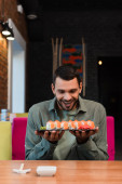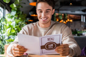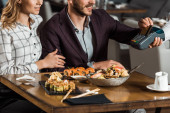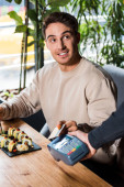 przycięty widok kelnerki trzymającej terminal płatniczy w pobliżu wesoły człowiek ze smartfonem