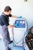 Konserwacja łodzi - Człowiek z polerki orbitalnej łodzi polerskiej w przystani. Skupienie selektywne.