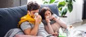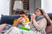 chory dziewczyna i chłopak kichanie i trzymając serwetki w mieszkaniu