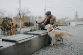 Starszy niewidomy mężczyzna z psem przewodnikiem siedzi na ławce w parku w mieście.