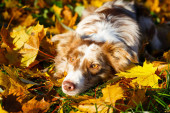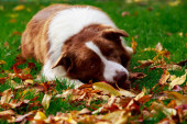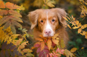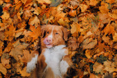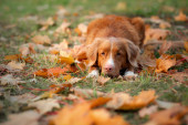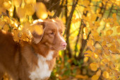 Pies w parku jesienią. Nova Scotia Duck Tolling Retriever, kolorowe liście