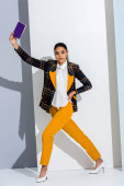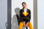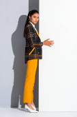 stylowa dziewczyna patrząc na aparat podczas pozowania na szaro-białe