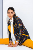 piękna i młoda kobieta patrząc w aparat na szarości i bieli