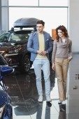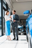 cheerful car dealer gesturing while looking at bearded man in car showroom