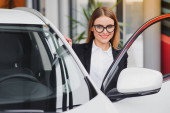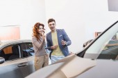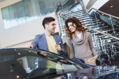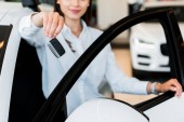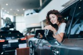 selektywne skupienie się na pozytywnej młodej kobiecie trzymającej klucz do samochodu