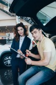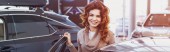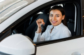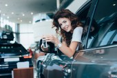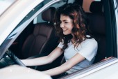 selektywne skupienie radosnej kobiety siedzącej w błyszczącym samochodzie