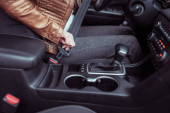 Zdjęcie "kobieta zapięła pasy w samochodzie, prawo jazdy, ruch lewostronny w przedziale pasażerskim. Automatyczna skrzynia biegów. Koncepcja bezpieczeństwa ruchu. Rozpinanie pasów bezpieczeństwa na parkingu." może być wykorzystywane do celów osobistych i komercyjnych zgodnie z warunkami zakupionej licencji Royalty-free. Obraz jest dostępny do pobrania w jakości wysokiej rozdzielczości do 5760x3840.