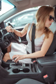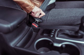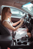 kobieta zapięła pasy w samochodzie, prawo jazdy, ruch lewostronny w przedziale pasażerskim. Automatyczna skrzynia biegów. Koncepcja bezpieczeństwa ruchu. Rozpinanie pasów bezpieczeństwa na parkingu.