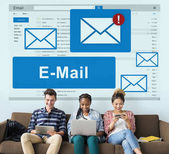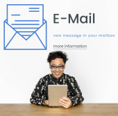 azjatycki seo manager trzymając papierowy kubek, za pomocą smartfona i stojąc w pobliżu e-mail ilustracja
