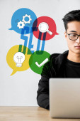 Zdjęcie "azjatycki seo manager trzymając papierowy kubek, za pomocą smartfona i stojąc w pobliżu e-mail ilustracja " może być wykorzystywane do celów osobistych i komercyjnych zgodnie z warunkami zakupionej licencji Royalty-free. Obraz jest dostępny do pobrania w jakości wysokiej rozdzielczości do 5760x3840.