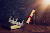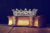 starożytna złota korona z kamieniami szlachetnymi na czerwonej tkaninie z książkami