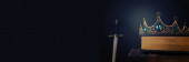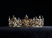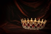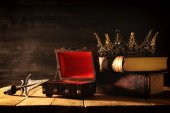 starożytna srebrna korona z kamieniami szlachetnymi na książkach na czerwonej tkaninie