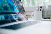 Zdjęcie "Człowiek pracujący z laptopem w biurze. Nowoczesny Office Interior koncepcja pracy obrazu." może być wykorzystywane do celów osobistych i komercyjnych zgodnie z warunkami zakupionej licencji Royalty-free. Obraz jest dostępny do pobrania w jakości wysokiej rozdzielczości do 5760x3840.