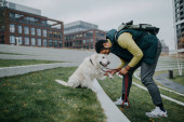 Młody ślepy mężczyzna z białym trzciny i pies przewodnik siedzi w parku w mieście.