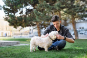Zdjęcie "Młody ślepy mężczyzna z białym trzciny i pies przewodnik siedzi w parku w mieście." może być wykorzystywane do celów osobistych i komercyjnych zgodnie z warunkami zakupionej licencji Royalty-free. Obraz jest dostępny do pobrania w jakości wysokiej rozdzielczości do 5760x3840.