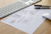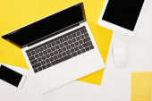 widok z góry laptopa, myszy komputerowej, roślin, szablon projektu strony internetowej na abstrakcyjnym tle geometrycznym
