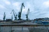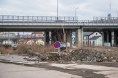 Betonowe bloki na drogach gruntowych i placu budowy w tle