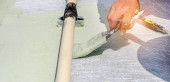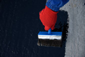 Pracownik stosuje mastyks bitumiczny na fundamencie