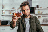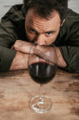 Zaniepokojony mężczyzna trzymający zapalniczkę obok wina i papierosów na stole kuchennym