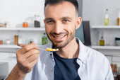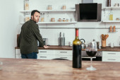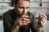 Selektywne skupienie się na uzależnionym od alkoholu człowieku trzymającym szklankę whisky i patrzącym w kamerę