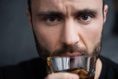 Zdjęcie "Selektywne skupienie się na uzależnionym od alkoholu człowieku trzymającym szklankę whisky i patrzącym w kamerę" może być wykorzystywane do celów osobistych i komercyjnych zgodnie z warunkami zakupionej licencji Royalty-free. Obraz jest dostępny do pobrania w jakości wysokiej rozdzielczości do 5760x3840.