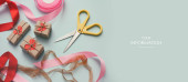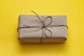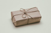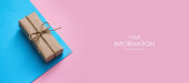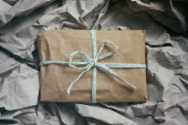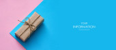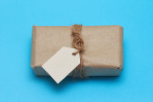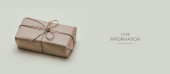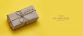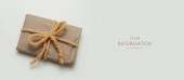 Mała paczka owinięta papierem rzemieślniczym i zawiązana niebieską nitką. Szare tło. Szablon artykułu internetowego. Długi format nagłówka banera. Kupon na sprzedaż. Wizytówka. Twoje informacje. Miejsce tekstowe.