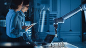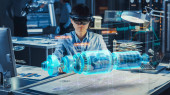 Zdjęcie "Inżynier przemysłowy współpracuje ze smartfonem przy użyciu rozszerzonej projekcji holograficznej rzeczywistości 3d Model Prototypu Generatora Elektrycznego. Rozwój aplikacji wirtualnej rzeczywistości mieszanej." może być wykorzystywane do celów osobistych i komercyjnych zgodnie z warunkami zakupionej licencji Royalty-free. Obraz jest dostępny do pobrania w jakości wysokiej rozdzielczości do 5760x3840.