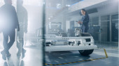 Inżynier przemysłowy współpracuje ze smartfonem przy użyciu rozszerzonej projekcji holograficznej rzeczywistości 3d Model Prototypu Generatora Elektrycznego. Rozwój aplikacji wirtualnej rzeczywistości mieszanej.