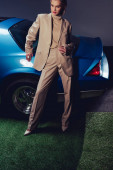 atrakcyjna i stylowa kobieta w garniturze stojąca w pobliżu samochodu retro