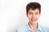 Portret młodego mężczyzny z aparatem dentystycznym na niebieskim tle