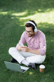 Zdjęcie "Ślepy człowiek w słuchawkach z książką i termo kubkiem na ławce obok psa przewodnika " może być wykorzystywane do celów osobistych i komercyjnych zgodnie z warunkami zakupionej licencji Royalty-free. Obraz jest dostępny do pobrania w jakości wysokiej rozdzielczości do 5760x3840.
