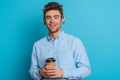Ślepy człowiek w słuchawkach z książką i termo kubkiem na ławce obok psa przewodnika