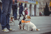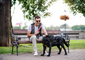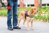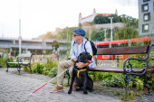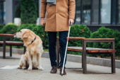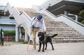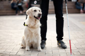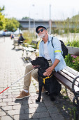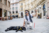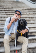 Nierozpoznany młody niewidomy z białą laską i psem przewodnikiem w mieście.