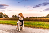 Zdjęcie "Pies gończy na wiejskiej drodze. Droga przez pola prowadzące do Austrian Village" może być wykorzystywane do celów osobistych i komercyjnych zgodnie z warunkami zakupionej licencji Royalty-free. Obraz jest dostępny do pobrania w jakości wysokiej rozdzielczości do 5760x3840.