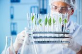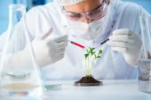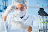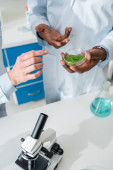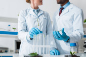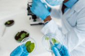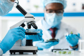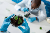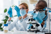 wybiórcze skupienie afrykańskiego biologa patrzącego na probówki ze szkłem powiększającym