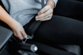 kobieta w samochodzie, siedząca za kierownicą samochodu, zapięła pasy, aktywowała poduszki powietrzne, odpięła pasy na parkingu, automatyczna skrzynia biegów z bliska.