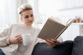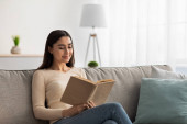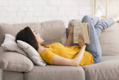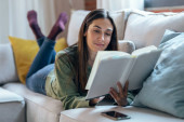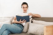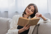 radosna młoda kobieta czytająca książkę podczas relaksu na kanapie w salonie