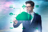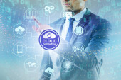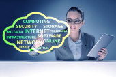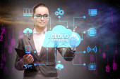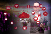 Koncepcja przetwarzania w chmurze z kobietami naciskającymi przyciski