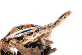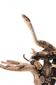 Python kręci się wokół drewnianej kłody odizolowanej na białym
