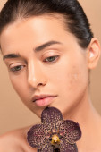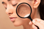młoda kobieta z zamkniętymi oczami i zmazaną skórą wyizolowana na beżu