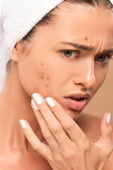 przycięty widok dziewczyny z problemem skóry patrząc na aparat odizolowany na beżu